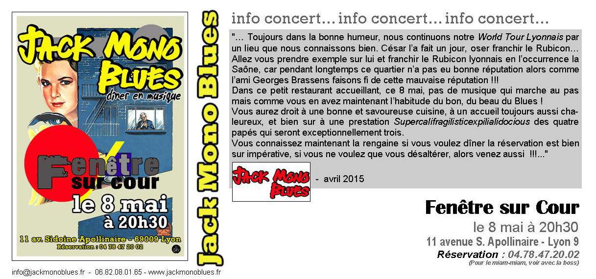 Fenêtre sur Cour – 11 av. Sidoine Apollinaire – 69009 Lyon – Résa tél : 04 78 47 20 02